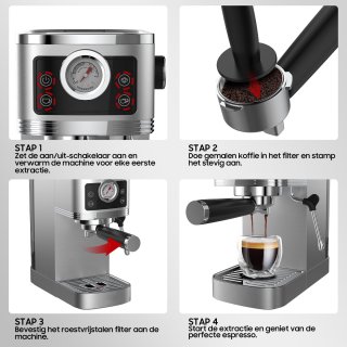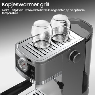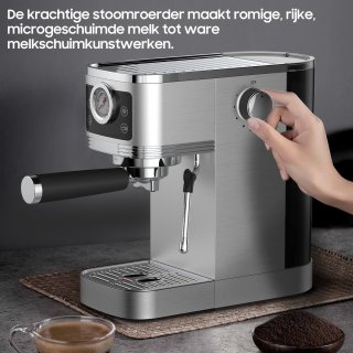 - Betrouwbare prestaties: 20 bar pompdruk en een ingebouwde manometer zorgen voor constante extrahering en consistente koffiekwaliteit, kopje na kopje.