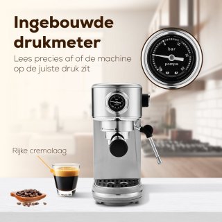 - Ingebouwde manometer (barometer) zodat je direct ziet of de druk ideaal is en je consistent uitstekende shots zet.